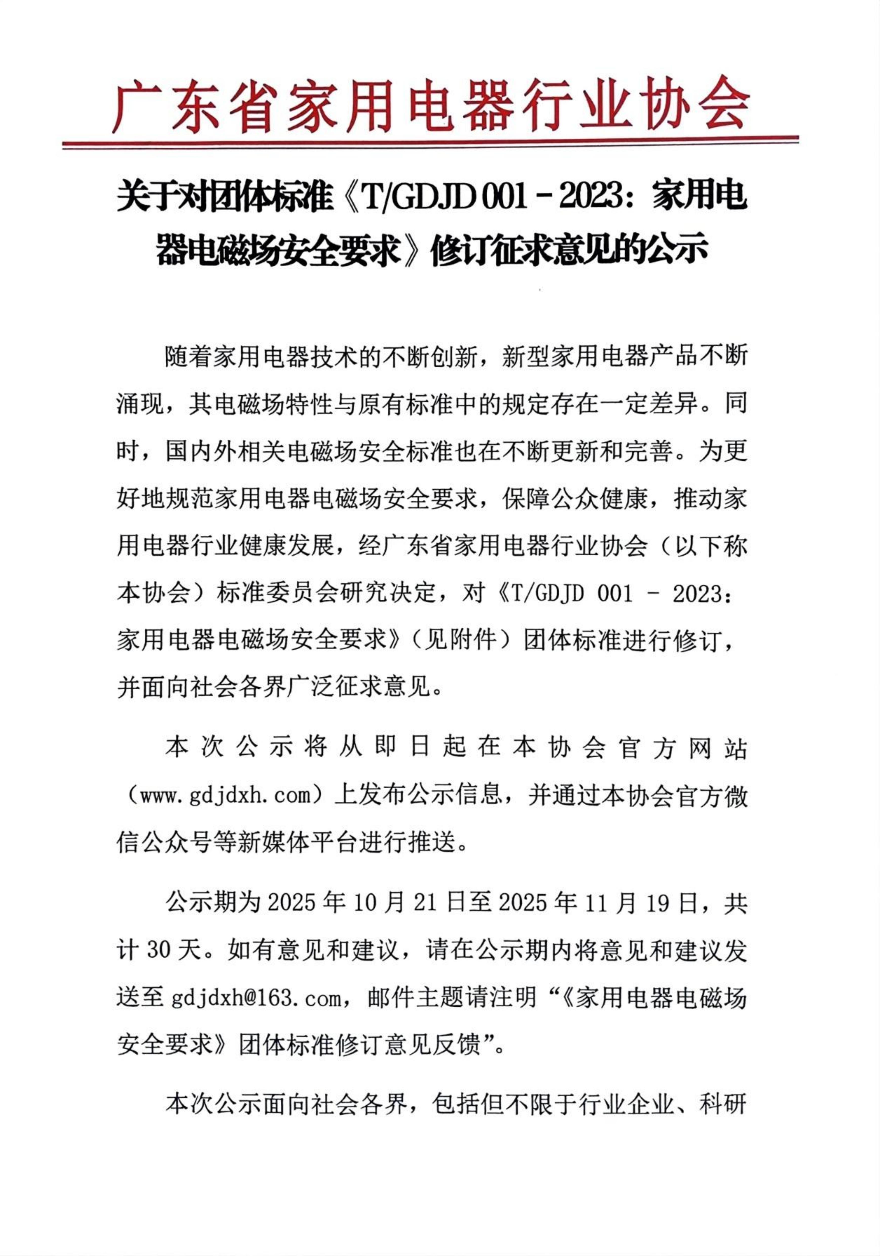 【团标修订公示】关于对团体标准《T/GDJD 001 - 2023:家用电器电磁场安全要求》修订征求意见的公示